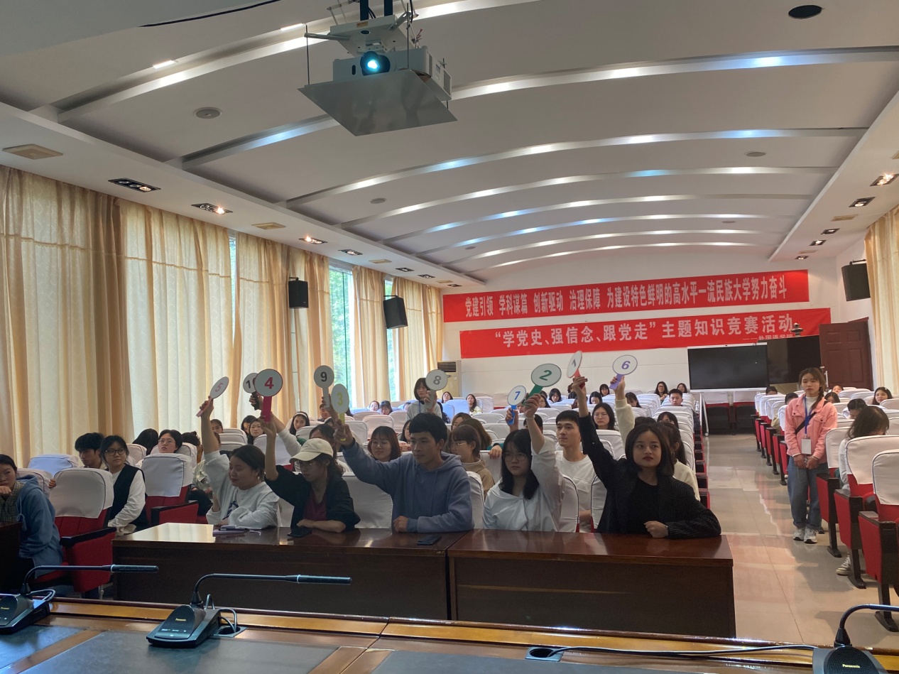 活动主要以党史为主要知识点,也辐射到了新中国史、改革开放史、社会主义发展史等相关内容。比赛总共设置了“必答题” “抢答题”“挑战题”和“观众自由答题”等四道题型。现场气氛热烈,选手们情绪高昂,沉着答题。经过近三小时的“轮番酣战”。最终决出一等奖四队、二等奖七队、三等奖九队。