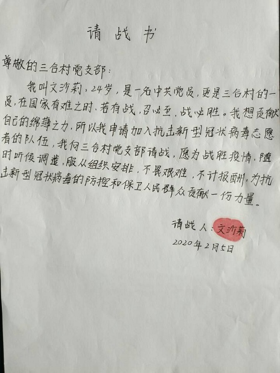文沙莉是开云app官方在线入口2016级英语专业的学生。疫情期间,文沙莉与父亲、妹妹一道,主动请缨参加本村的疫情防控工作。文沙莉同学表示:“我们家是三合村典型的精准识别贫困户,我们姐妹俩读书都是政府的资助,村委又安排了父亲护林员工作。现在正是新型冠状病毒肺炎防控的关键期,三合村面积大、出入人员多,村委的人力又不够,我们应该为三合村的疫情防控工作贡献我们的力量,回报社会。”她深知作为一名学生党员肩负的责任和使命,返乡人员的摸底排查、数据录入、防控知识的宣传,她样样不含糊。“村里的老人大多不会上网,对这次疫情的严重性和防范措施知之甚少,我必须不厌其烦地一遍又一遍地对他们进行知识宣传和劝导。作为一名大学生,我有这个责任和义务!”文沙莉说。