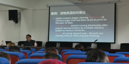 互动环节,王老师让在场师生做了货物英语如何表达的训练,“Shipments用于批量发出的货物,Consignments用于接收或到达目的港的货物,Items用于快递接收的货物,Goods则是所有货物的统称。”王斌老师结合了自己的工作经验,做出了耐心细致的回答,博得师生们的阵阵喝彩。