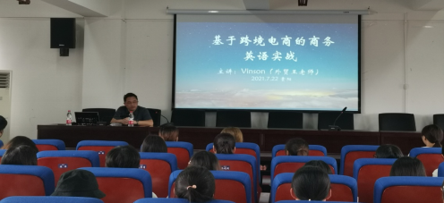 2021年7月23日上午10 : 00,我院特邀高级经济师、全国外贸业务员岗位考试与培训中心副主任王斌老师于我校15号教学楼1109会议室开展学术讲座,主题为“基于跨境电商的商务英语实战”。我院商务英语系全体师生现场聆听讲座。