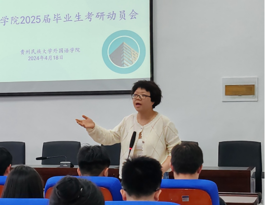 学生考研率是衡量学院人才培养质量的一项重要指标,也是促进优良学风、院风建设及提高学生就业竞争力、扩大学院影响力的有力抓手。为营造浓厚的考研氛围,切实加强对学生考研的指导与服务,提高学院考研的数量和质量,有力助推学院高质量发展,外国语学院于2024年4月18日晚上18:00在北校区开云app官方在线入口416会议室举行2025届毕业生考研动员大会。会议由开云app官方在线入口副院长赵艳主持,出席此次会议的还有学院日语系系主任李海老师、各辅导员、班主任。2020级部分学生代表、2021级全体学生参会。