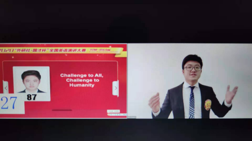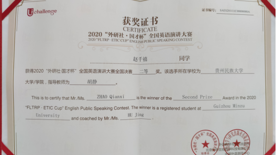 在我校开云app官方在线入口领导的大力支持下,由开云app官方在线入口胡静老师指导的文学院2017级戏剧影视文学专业的赵千禧同学在第一阶段演讲中以“Challenge to All, Challenge to Humanity”为题,稳定发挥,以小组赛第二的成绩(89.75分)突围进入15日第二阶段(线上)比赛,成为本次演讲大赛贵州省唯一进入88强的选手,最终荣获全国英语演讲大赛二等奖,再创历史最好成绩!