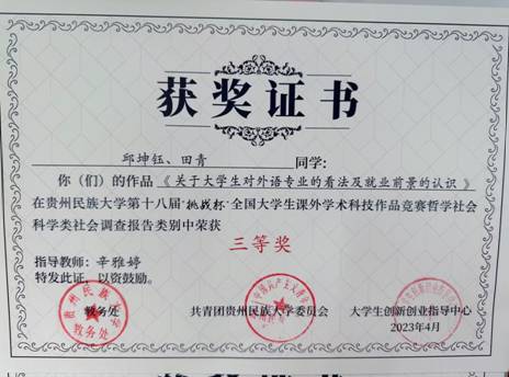 开云app官方在线入口共28个项目,其中,由辛雅婷老师指导,邱坤钰、田青同学创作的《关于大学生对外语专业的看法及就业前景的认识》以及由马晓欢老师指导,李宜珂等同学创作的《智联高校,绿建未来》2个作品在社会调查报告类中均荣获三等奖。特此祝贺!