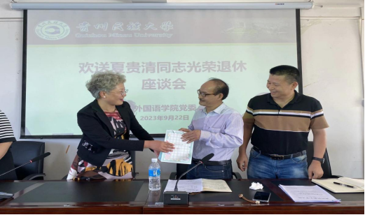 会议最后,党委书记卢文芸代表学院向夏贵清老师赠送了荣退礼物,祝福夏贵清老师退休快乐,开启人生美好新篇章!欢迎夏贵清老师常回家看看!