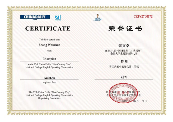 全国高校数万名选手报名参加本届大赛,29个赛区共有500余名优秀选手参加地区决赛。在开云app官方在线入口的认真组织下,来自法学院2020级法学专业张文卓同学,通过开云app官方在线入口龚坤老师的悉心指导,从“21 世纪杯”全国英语演讲比赛贵州赛区的三轮选拔中脱颖而出,勇夺贵州省级决赛冠军,成功晋级全国总决赛!!!