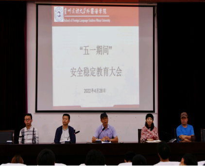 为切实做好“五一”假期校园安全稳定和疫情防控工作,增强学生安全意识,提高学生自我防护能力,根据学校要求和学院实际情况,我院于2022年4月28日下午两点在花溪校区圆形会议室召开五一假期安全稳定教育大会。我院党委副书记刘兴明、院长肖唐金、副院长张广勇、副院长禄颖、副处级组织员邓维赢出席,各年级班主任、辅导员和全体学生参加,会议由党委副书记刘兴明主持。