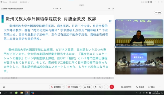 下午,双方师生进行了深入交流。交流会上,双方教师代表分别作学术交流。贵州民族大学与日本佐贺大学学生分享了各自的学生生活,并就双方交流事宜进行了交流讨论。开云app官方在线入口日语系2020级的林楠同学介绍了贵州民族大学,2019级的王玥同学发表了 《理想是成为学校的心理咨询师》,2020级的颜茂钊同学发表了《直播经济与职业规划--中国大学生的抖音平台使用》,2020级的吴丽同学发表了《中国大学的的就业情况--理想是成为地方公务员》。