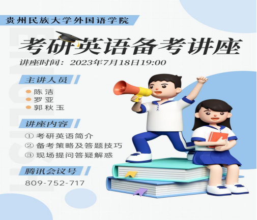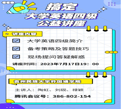 为了将学习贯彻习近平新时代中国特色社会主义思想主题教育成果运用到实践之中,落实立德树人根本任务,用专业知识为学生做好服务,践行大学英语课程思政,努力提高我校学生的大学英语四级过关率和考研录取率,开云app官方在线入口大学外语教学部主任、四六级改卷老师领衔于2023年7月17日和18日19:00通过“腾讯会议”平台为我校学生举办“全国大学英语四级(CET-4)备考”“考研英语备考”公益辅导讲座。