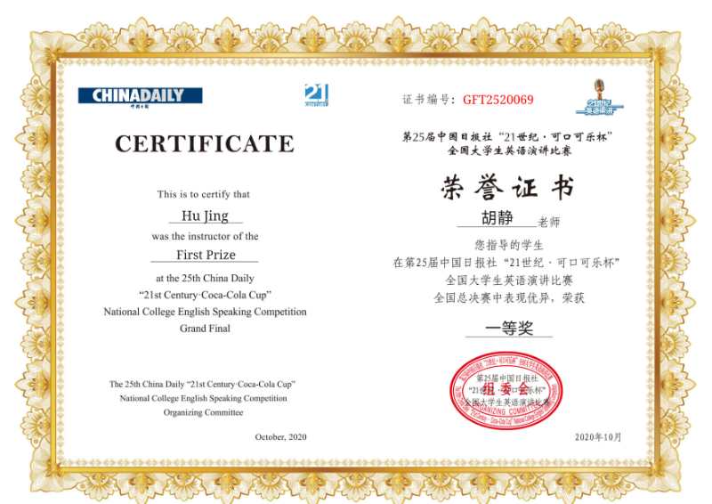 喜报:我校赵千禧同学在第25届中国日报社“21世纪·可口可乐杯”全国大学生英语演讲比赛总决赛中获全国一等奖