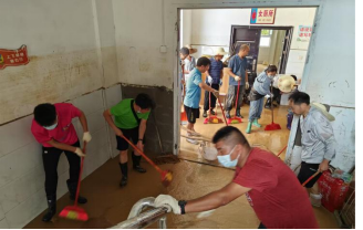 吴贤勇(右四)、杨卓远(右五)在当地受灾群众家中帮忙清理淤泥
