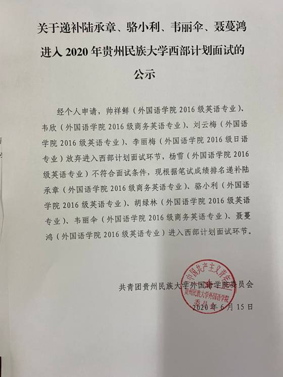 关于递补陆承章、骆小利、韦丽伞、聂蔓鸿进入2020年贵州民族大学西部计划面试的公示